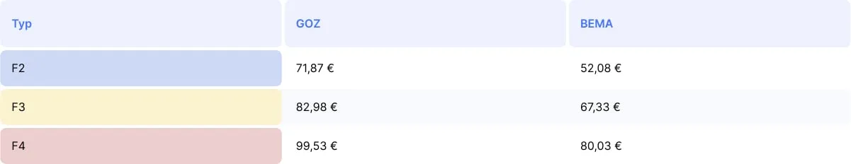 Erklärungsbeispiel Patient 1: Zweiflächige MKV-Füllung (52,08€), plus GOZ-Honorar für die zweiflächige Füllung (71,87€), plus erbrachte BEMA-Leistungen bmf und l1 (27,18€) r, plus GOZ: 2040 und 1020 (14,86€) ergibt zusammen 165,99€