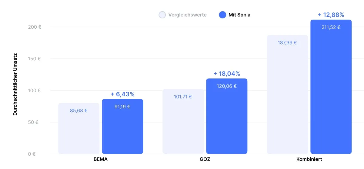 Nach Einführung der KI-Assistenz Sonia stieg der durchschnittliche Umsatz für MKV-Füllungen bei GKV-Patienten um 12,88 %. Die Umsätze erhöhten sich im BEMA-Bereich um 6,43 % und im GOZ-Bereich um18,04 %, was einem kombinierten durchschnittlichen Gesamtumsatz von211,52 € pro Behandlung entspricht.